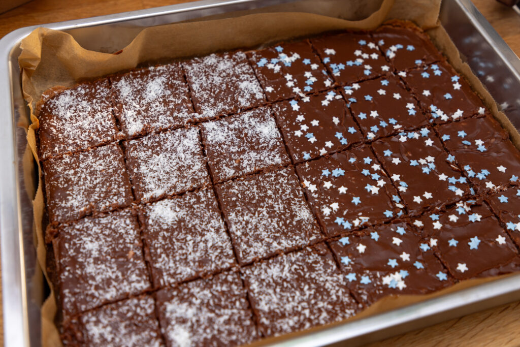 5. Wenn der Kuchen abgekühlt ist, die Butter für die Glasur schmelzen und mit einem Schneebesen mit allen anderen Zutaten (außer Kokosraspel) glatt rühren. Die Glasur gleichmäßig auf dem Kuchen verstreichen und mit Kokos und/oder Streuseln garnieren.