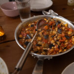 1. Eine Ofenform/Blech (Größe ca. 30×40 cm, kann aber auch rund sein) mit Backpapier auslegen, sodass an den Seiten etwas Backpapier hoch steht. Den Backofen auf 175 °C vorheizen.