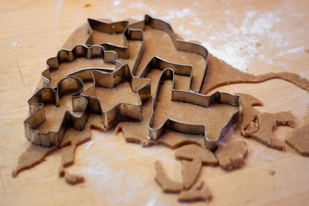 2. Einen Teil des Teigs auf einer bemehlten Arbeitsfläche dünn ausrollen. Figuren ausstechen, auf mehrere mit Backpapier ausgelegte Bleche verteilen. Die Kekse gehen beim Backen auf, also nicht zu nah aneinander legen. Bei uns werden es 3-4 Bleche.